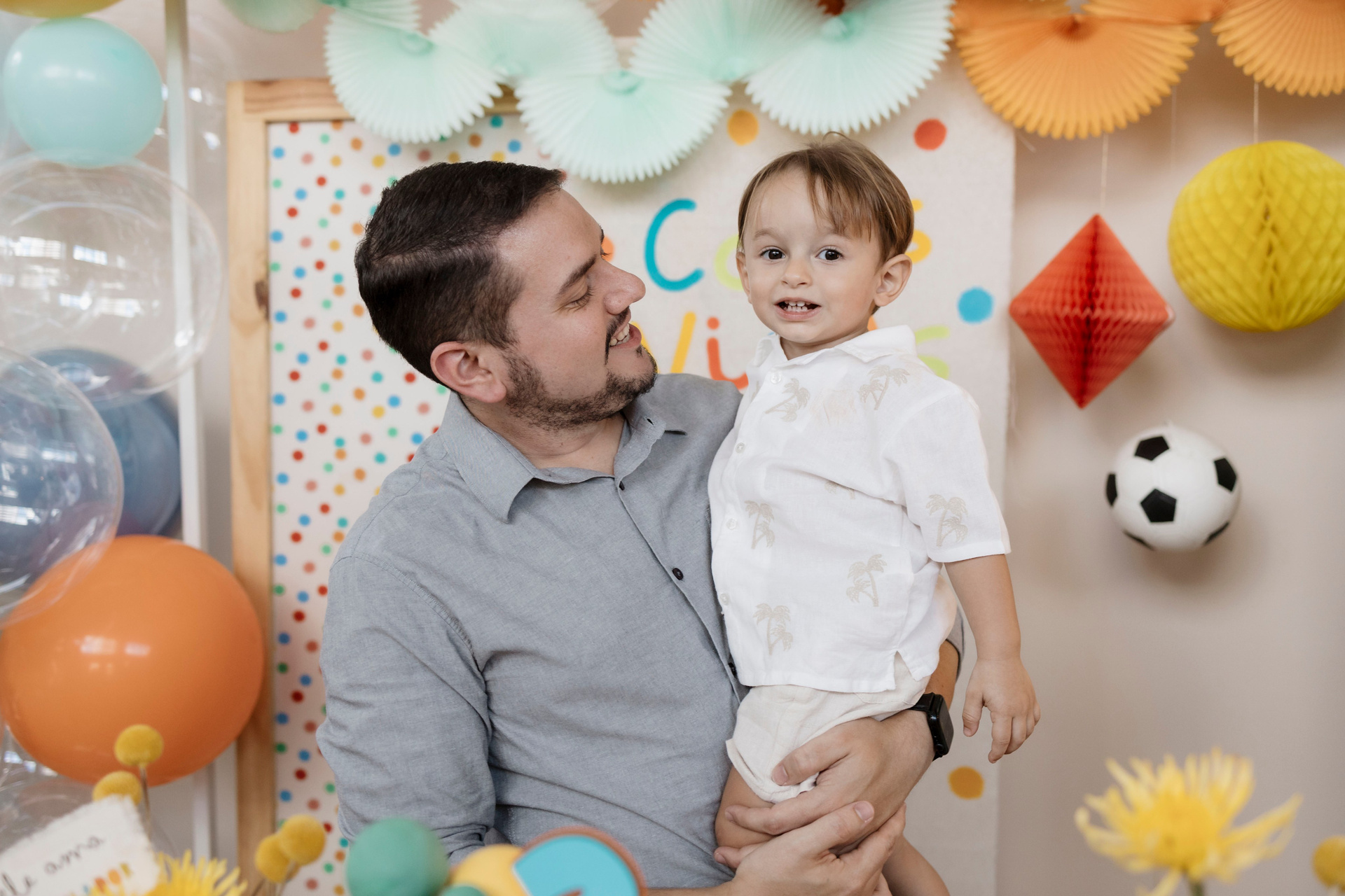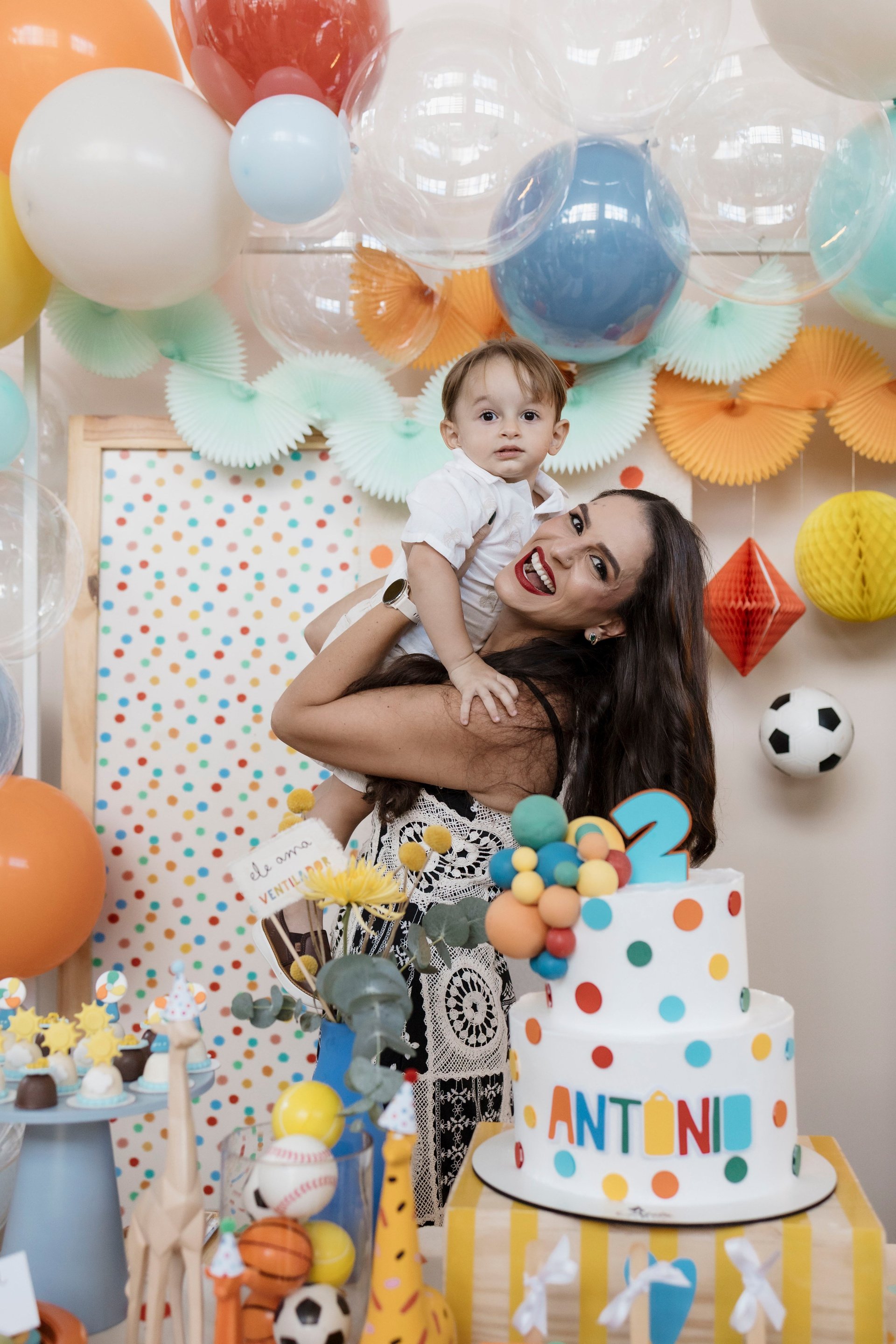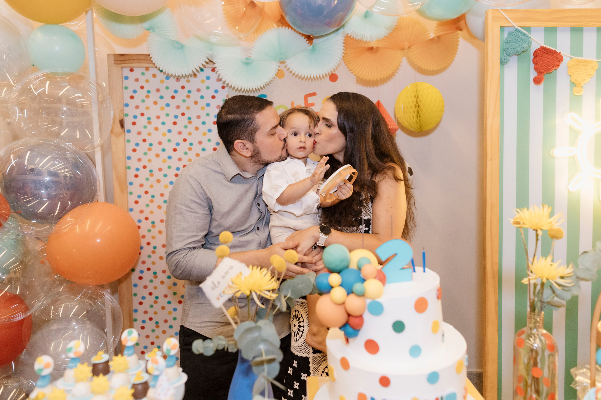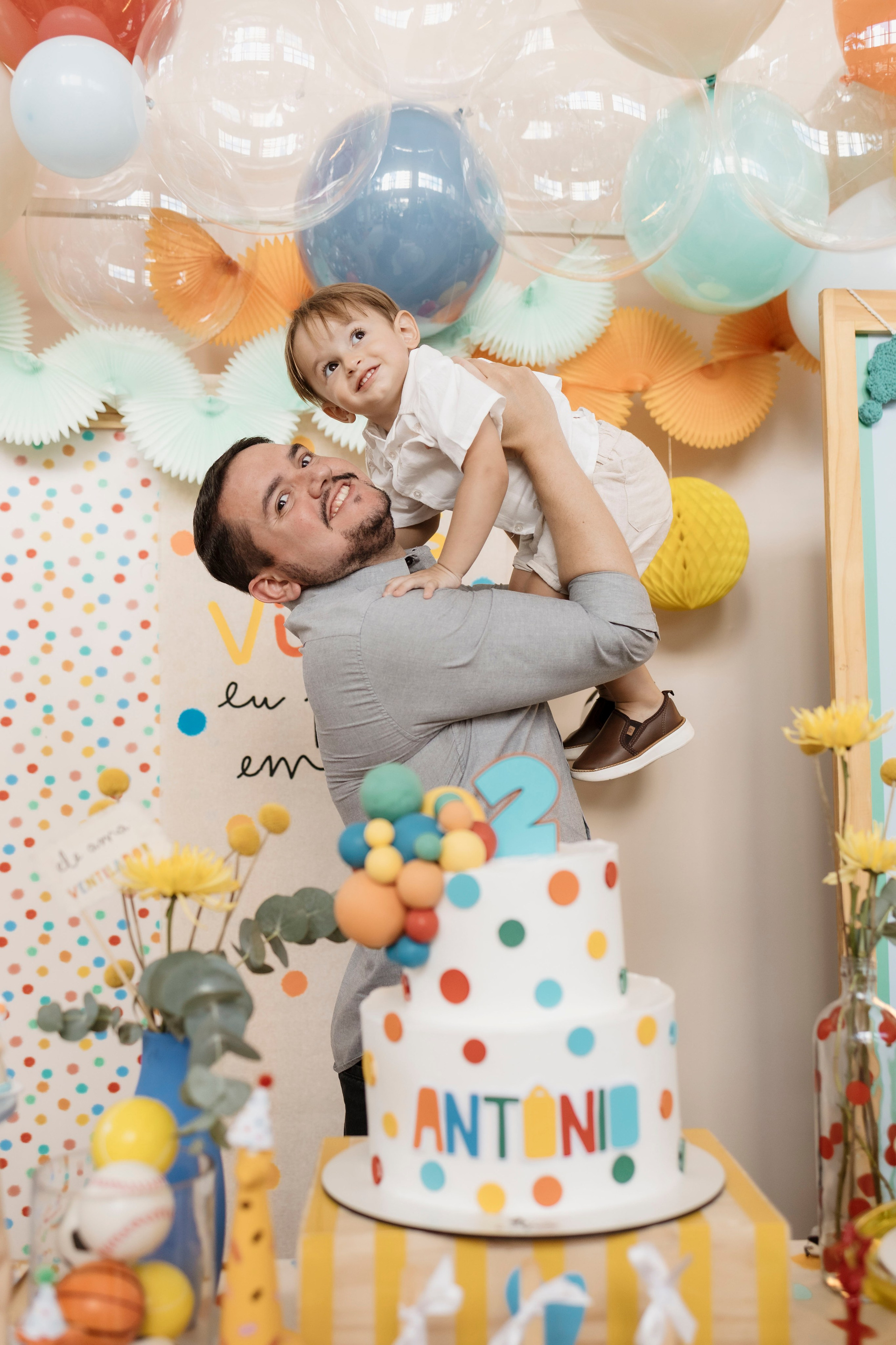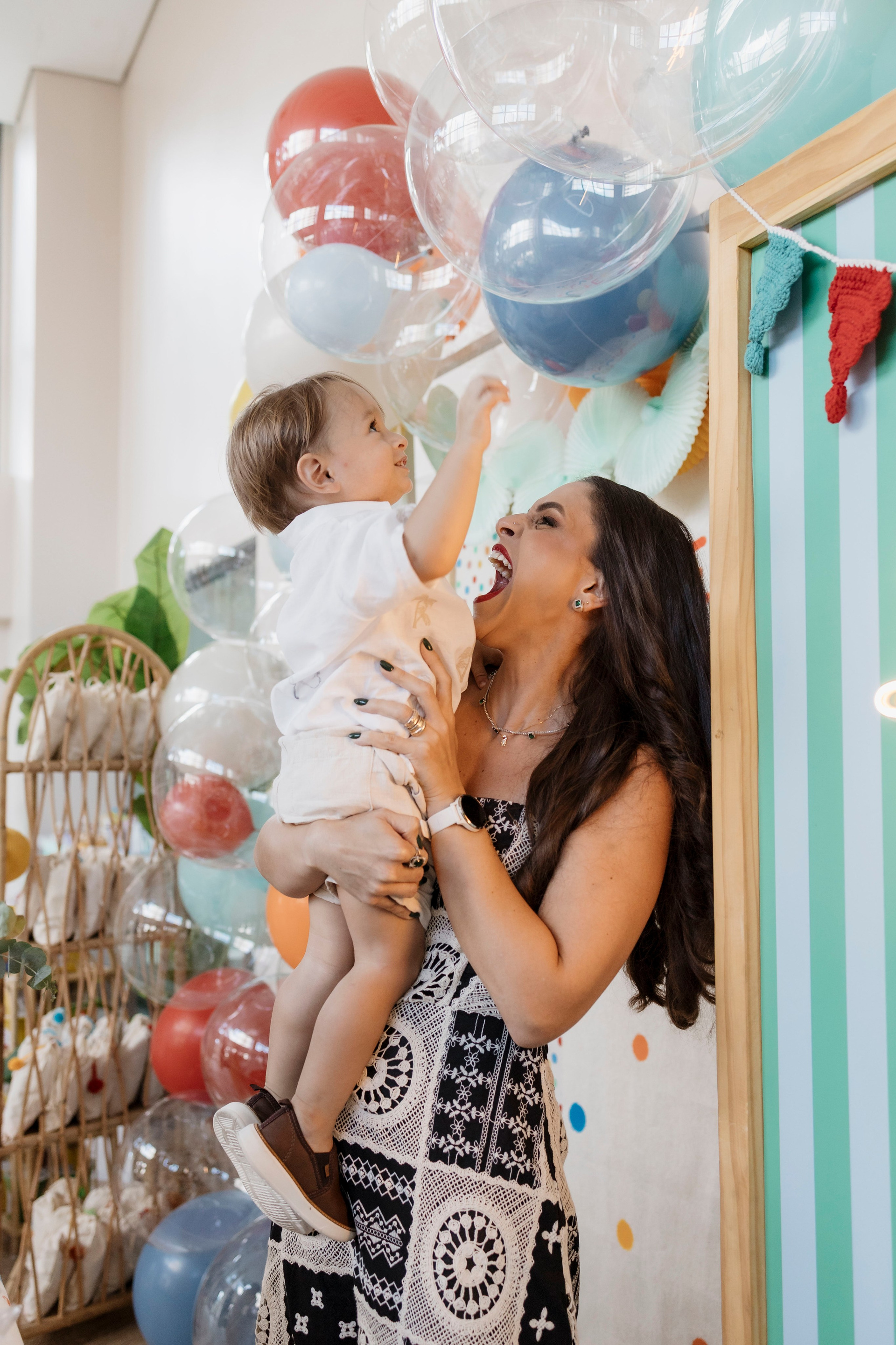 Tudo ali partia do que faz sentido para ele nessa fase: o movimento das bolas, o vento do ventilador, o sol, a curiosidade em descobrir o espaço e as pessoas ao redor. Uma festa pensada no tempo da criança, sem pressa e sem excessos.
