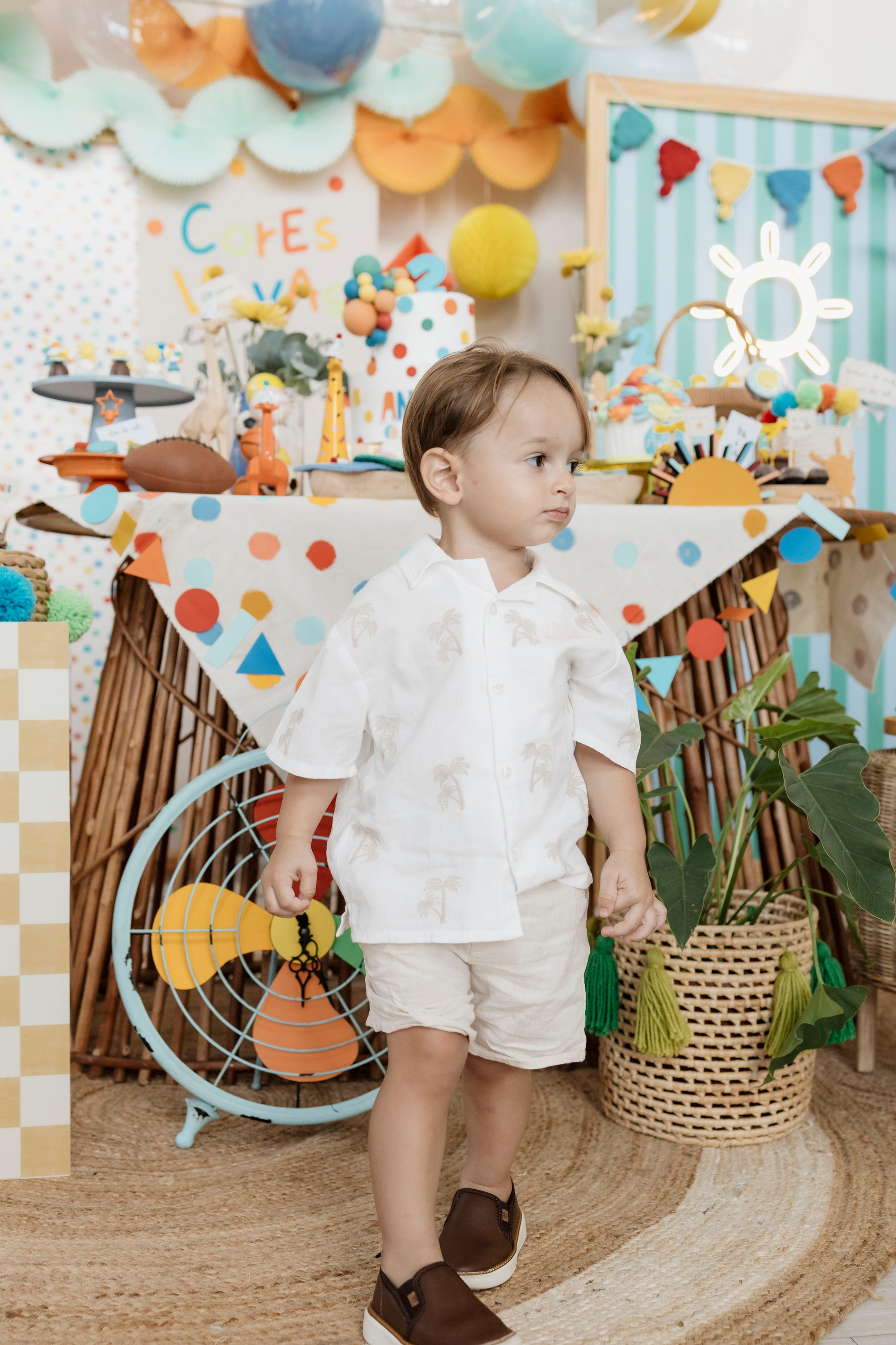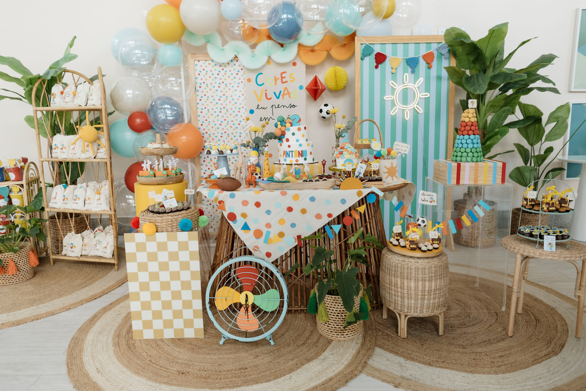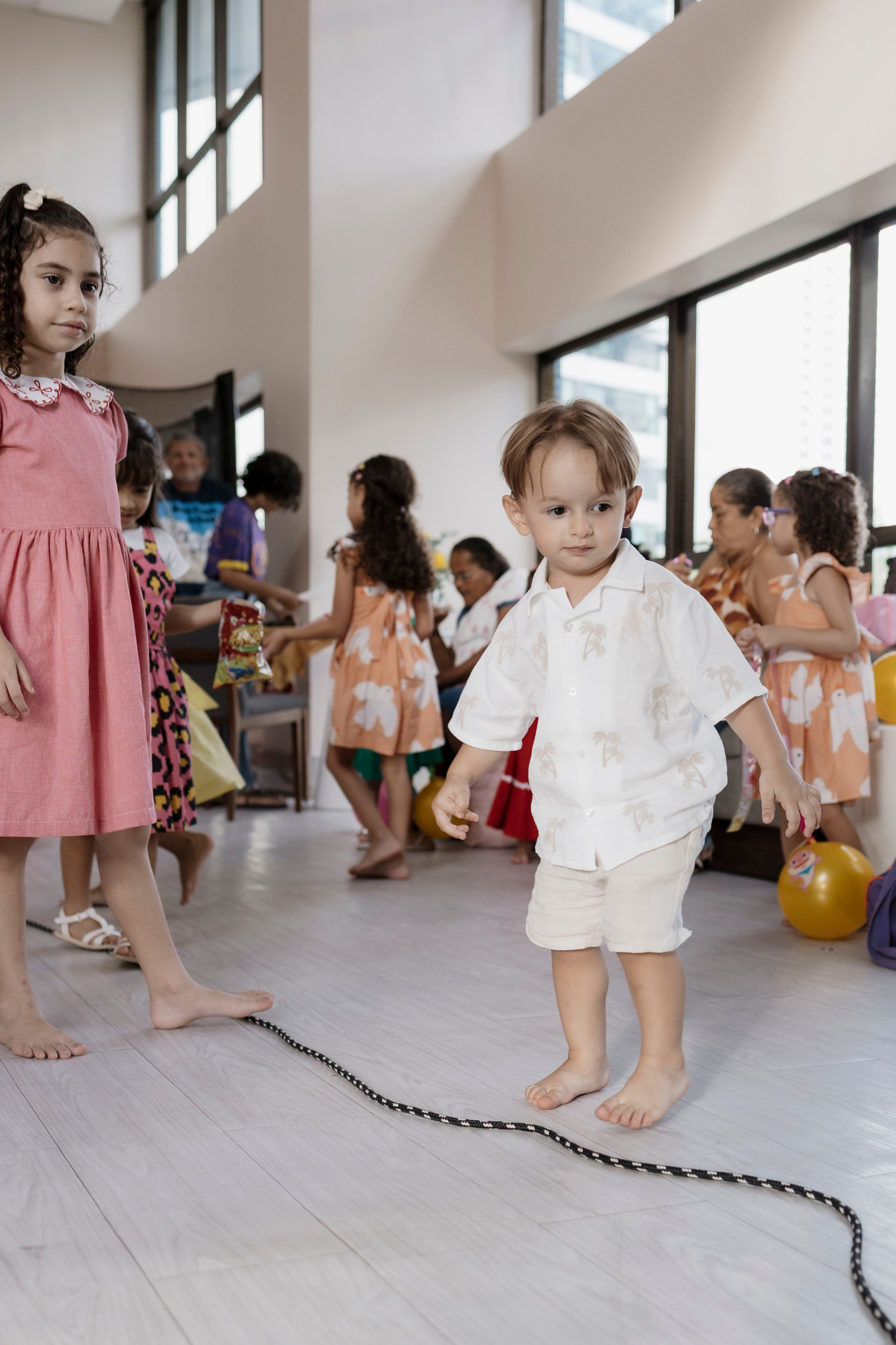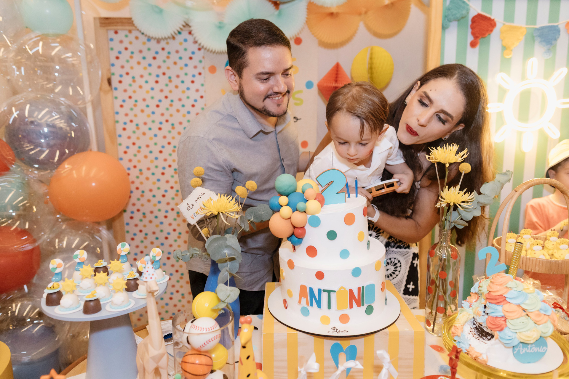 Tudo ali partia do que faz sentido para ele nessa fase: o movimento das bolas, o vento do ventilador, o sol, a curiosidade em descobrir o espaço e as pessoas ao redor. Uma festa pensada no tempo da criança, sem pressa e sem excessos.