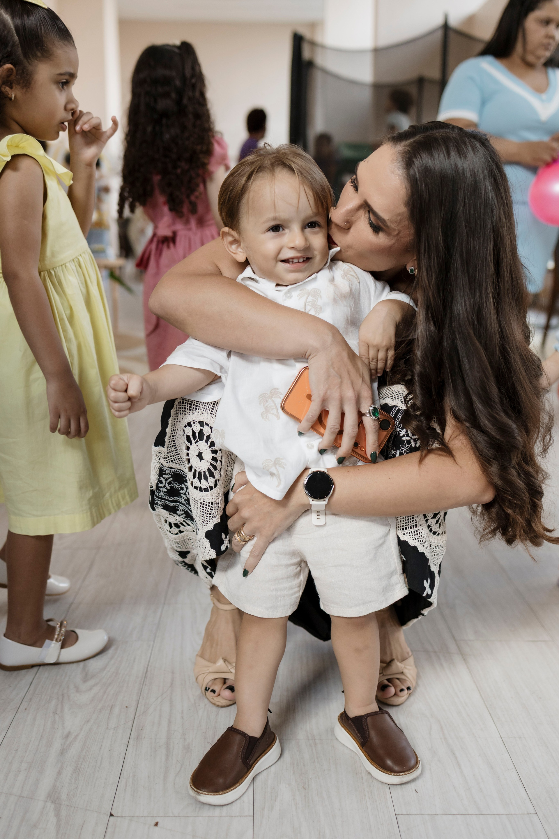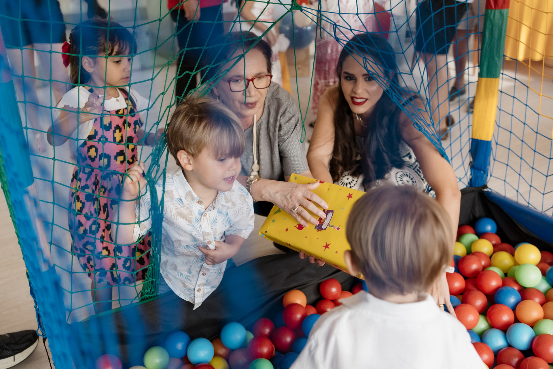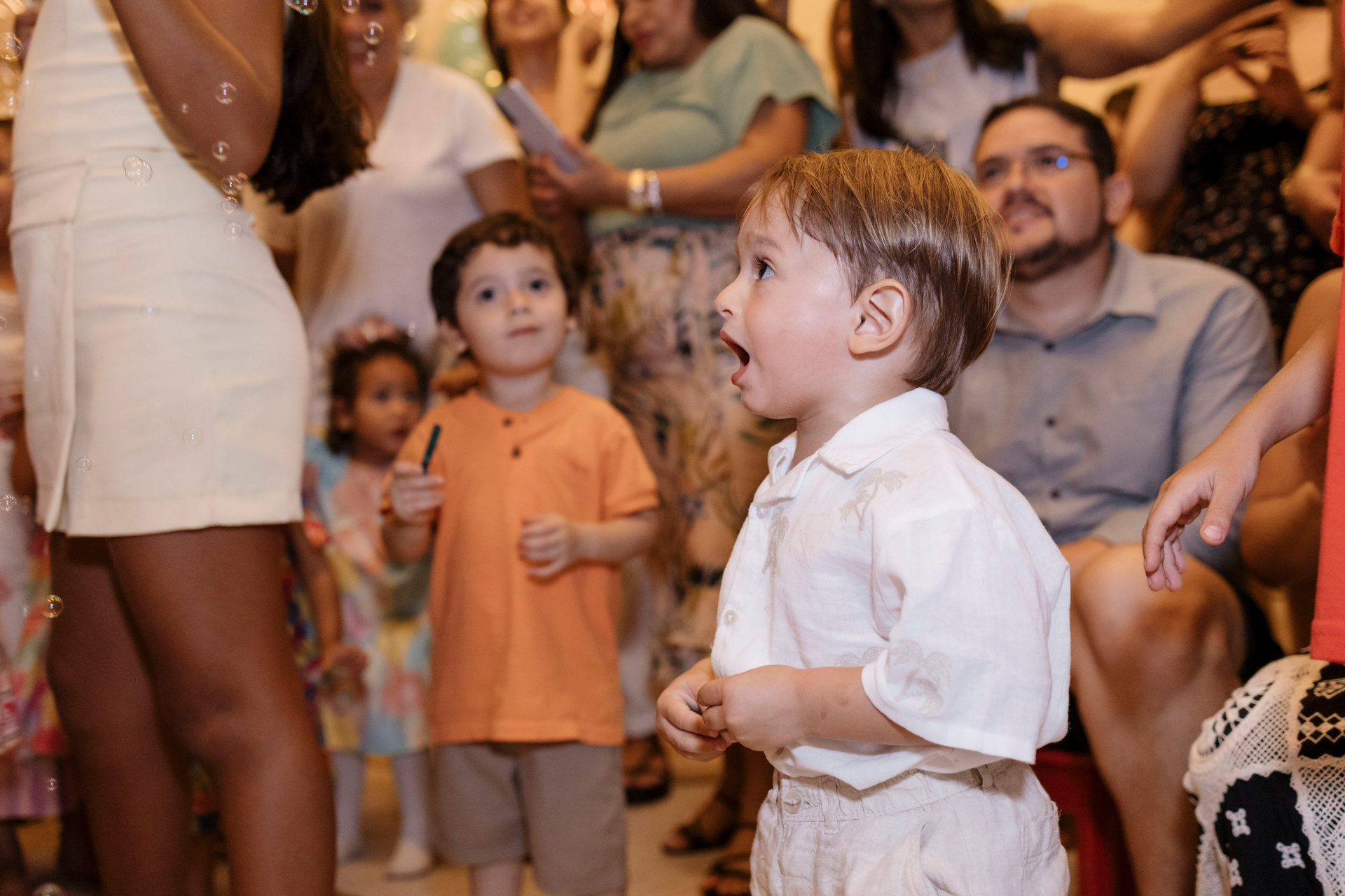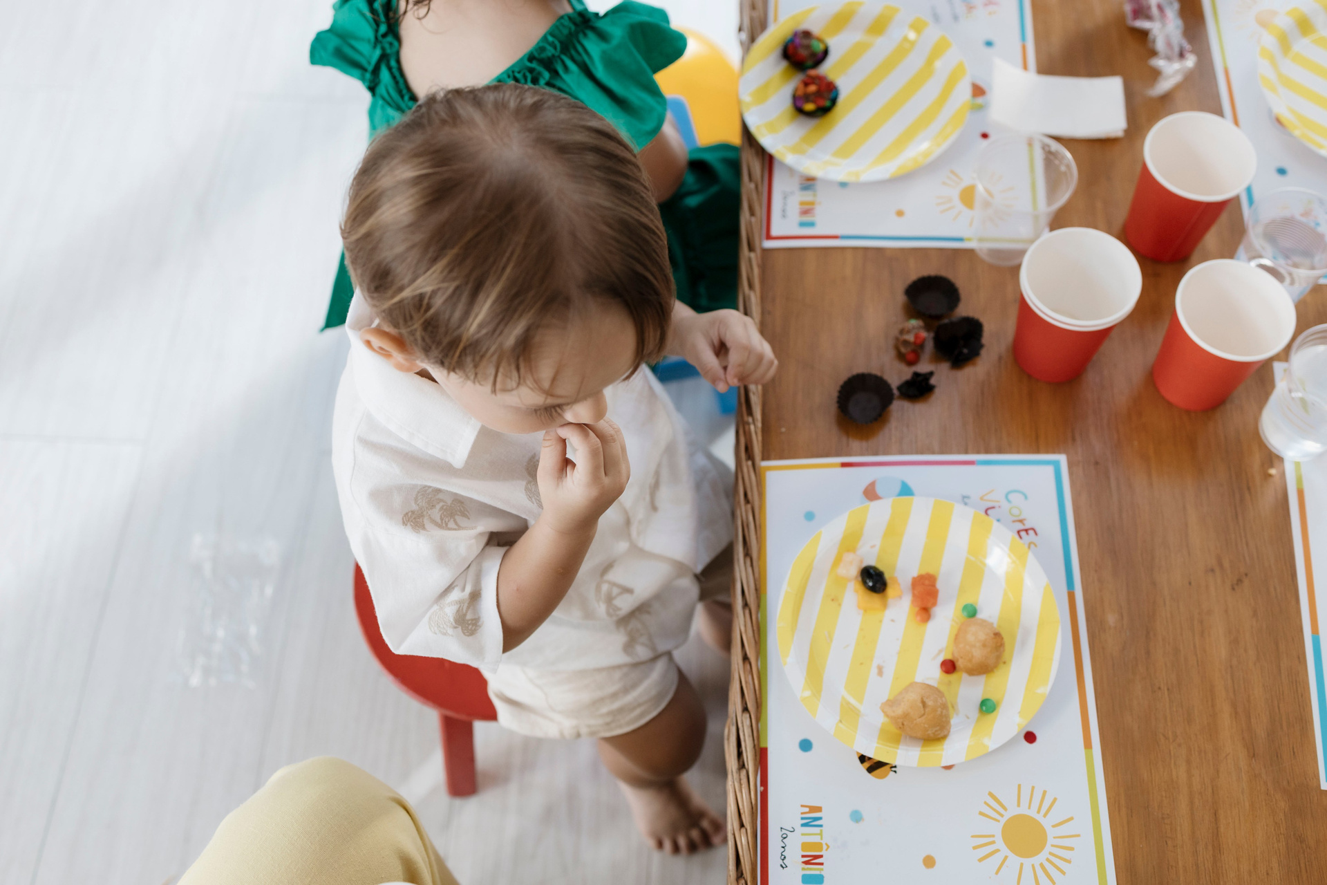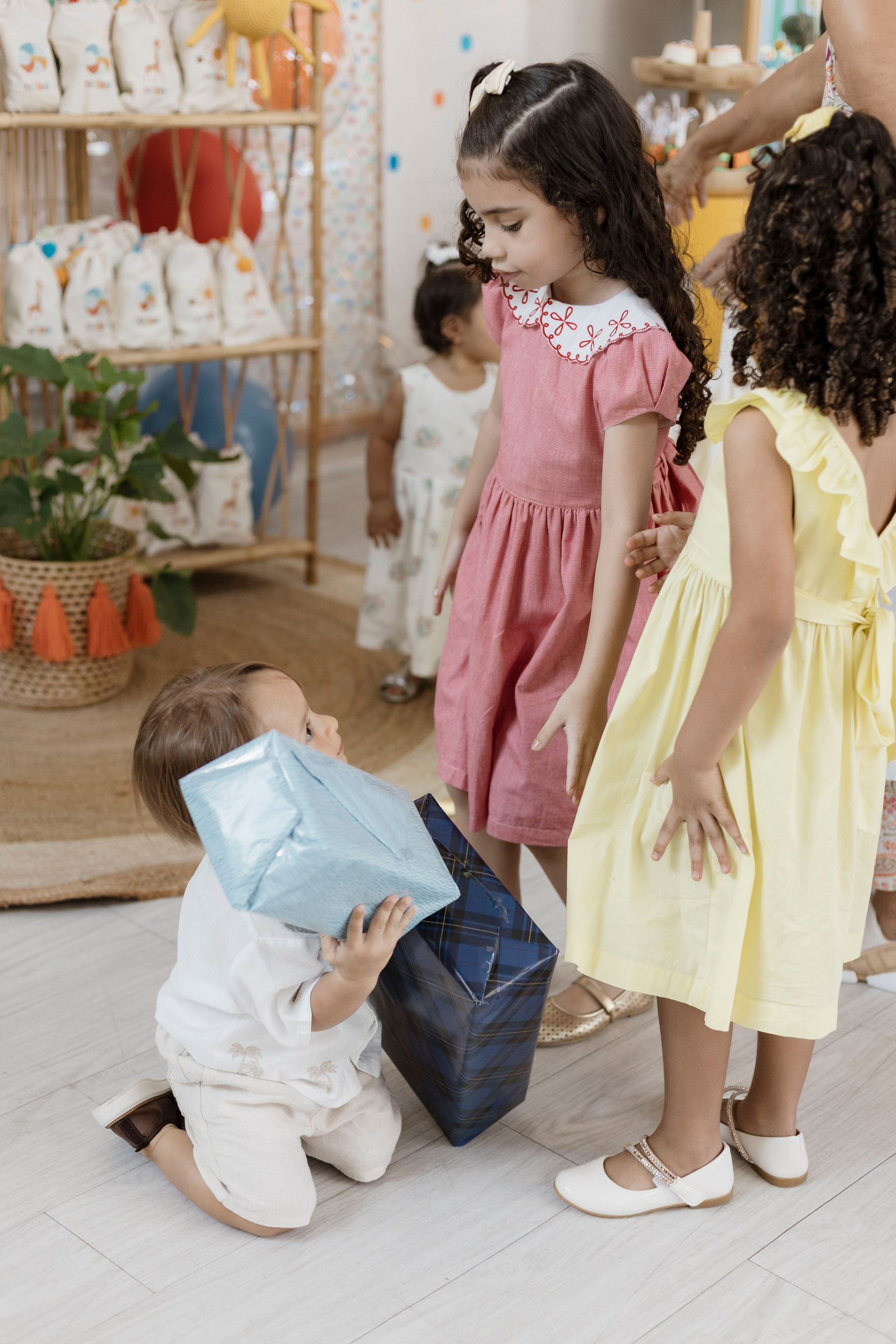 Tudo ali partia do que faz sentido para ele nessa fase: o movimento das bolas, o vento do ventilador, o sol, a curiosidade em descobrir o espaço e as pessoas ao redor. Uma festa pensada no tempo da criança, sem pressa e sem excessos.