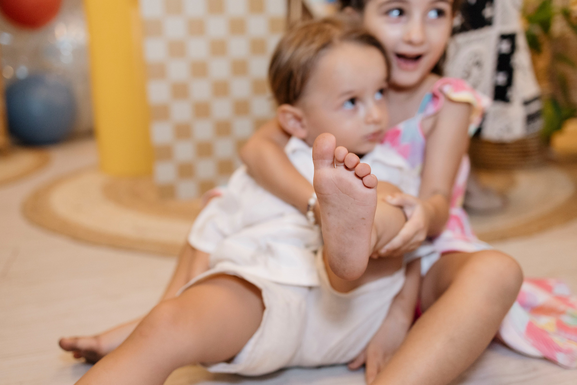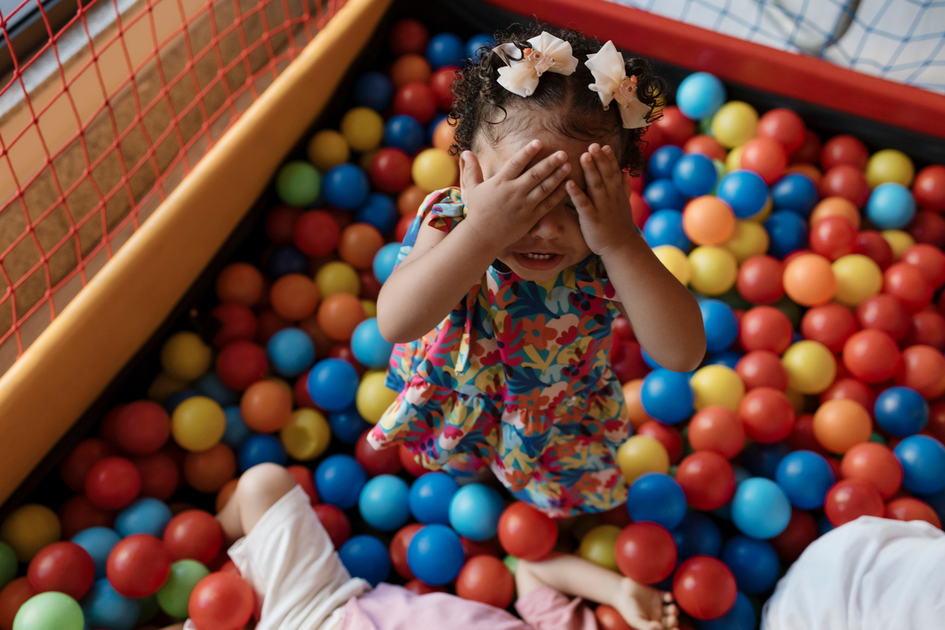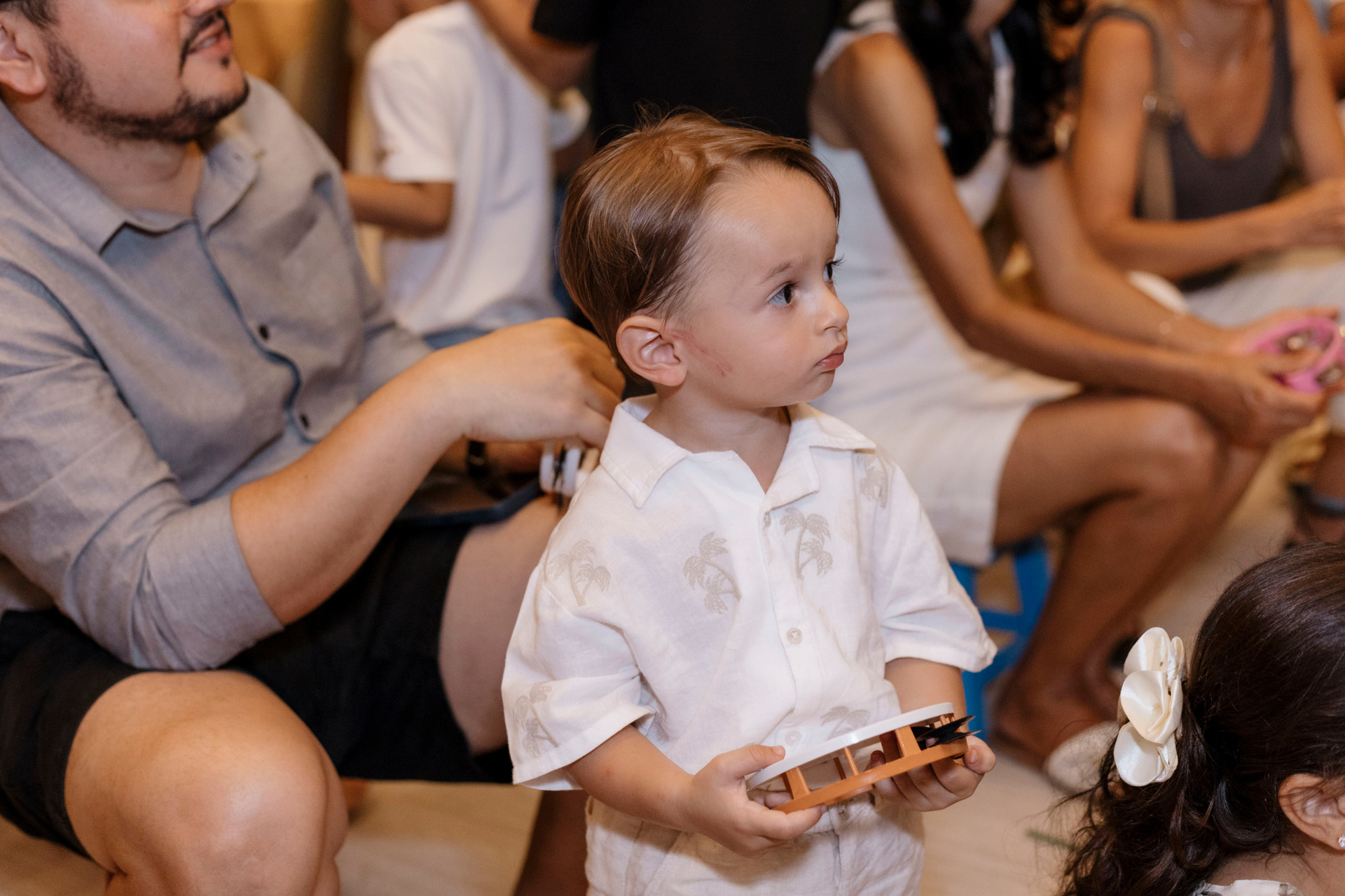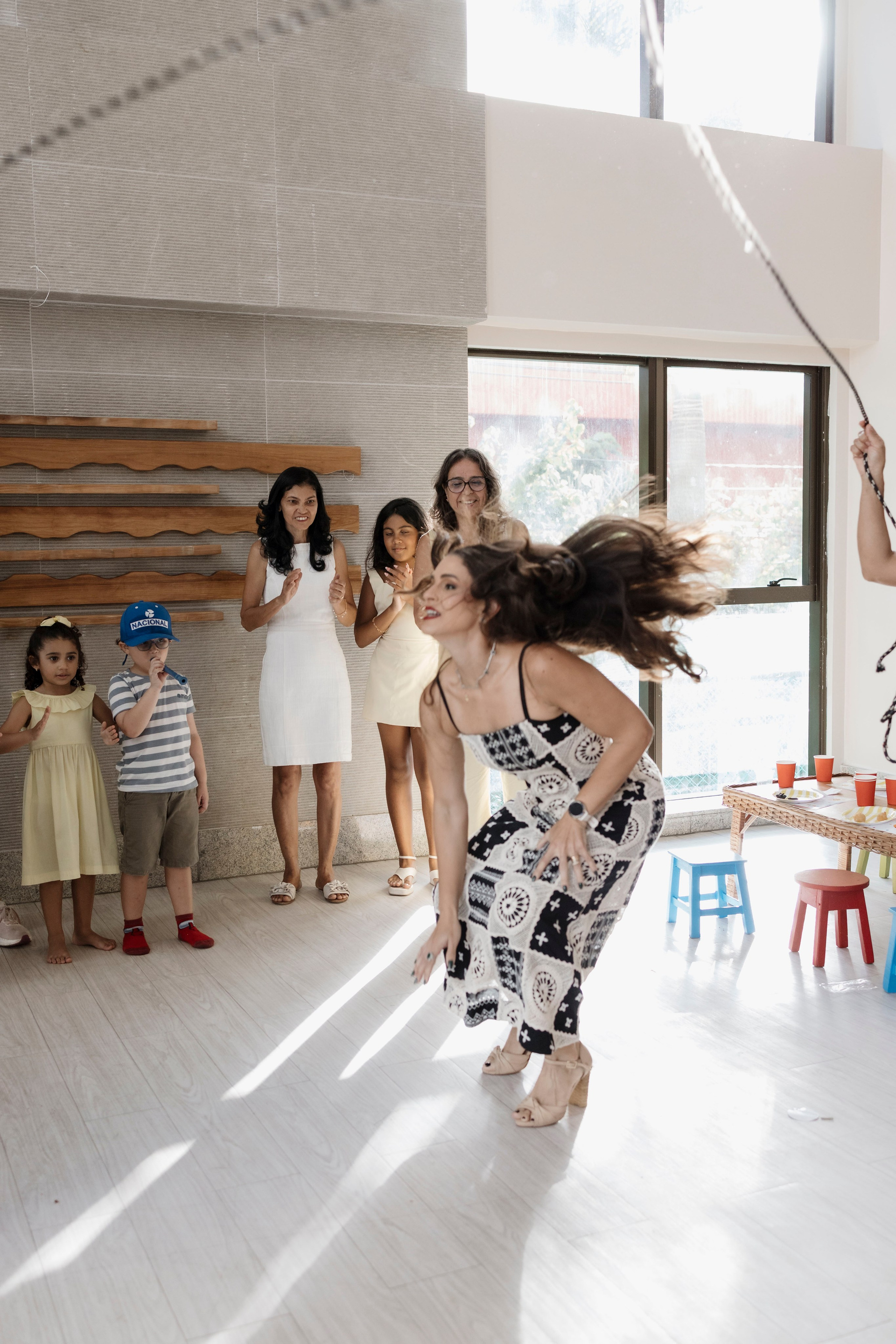 Tudo ali partia do que faz sentido para ele nessa fase: o movimento das bolas, o vento do ventilador, o sol, a curiosidade em descobrir o espaço e as pessoas ao redor. Uma festa pensada no tempo da criança, sem pressa e sem excessos.
