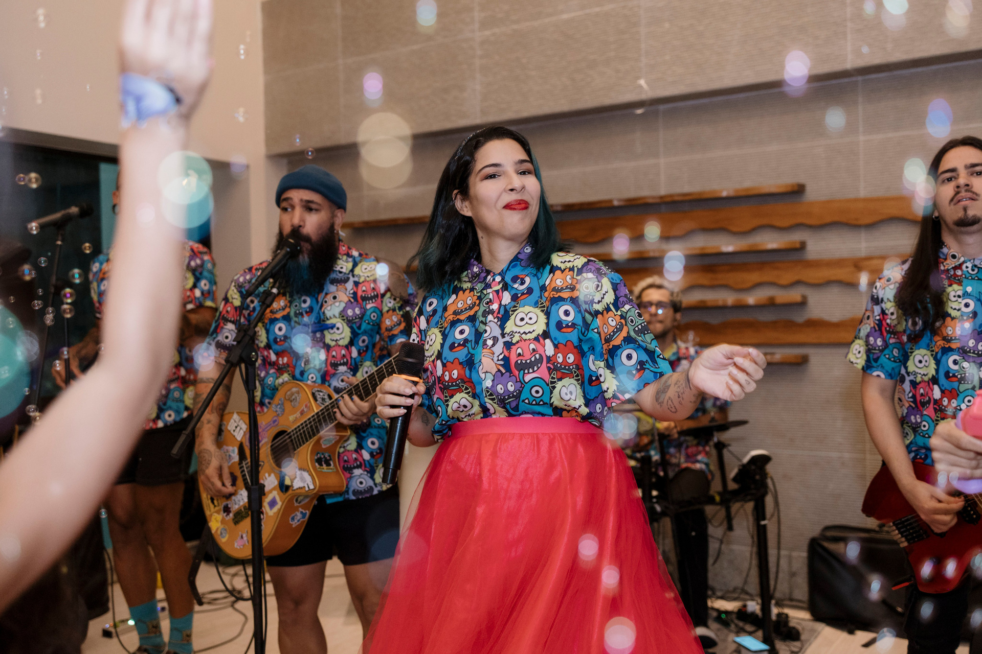 A decoração, criada pela Garimpe e Decore, ajudou a transformar essas referências simples em um cenário bonito e cheio de significado. Já a animação da Ludicanto trouxe música ao vivo e um show de rock que envolveu crianças e adultos, do jeito que essa família ama: junto, misturado, participativo.