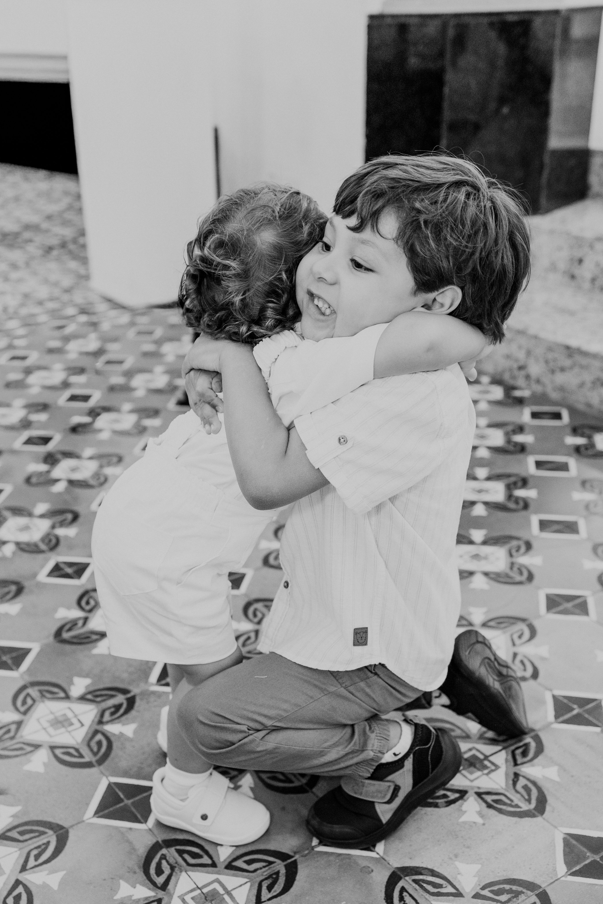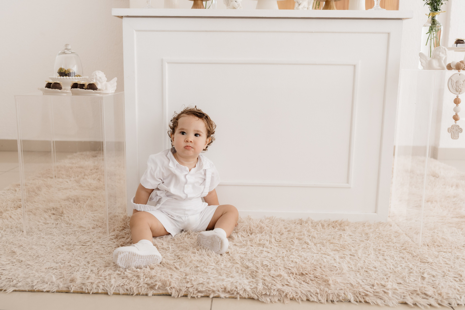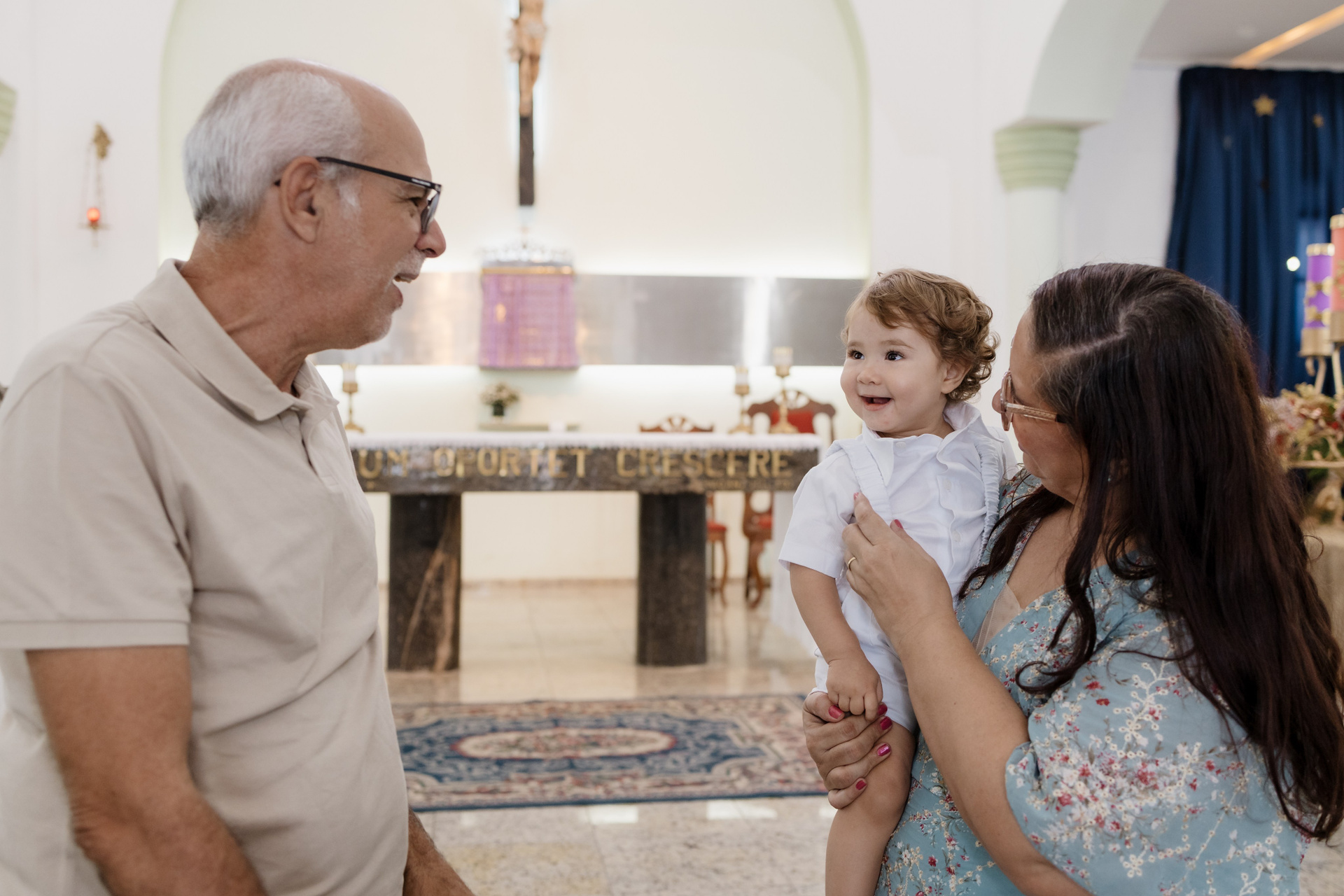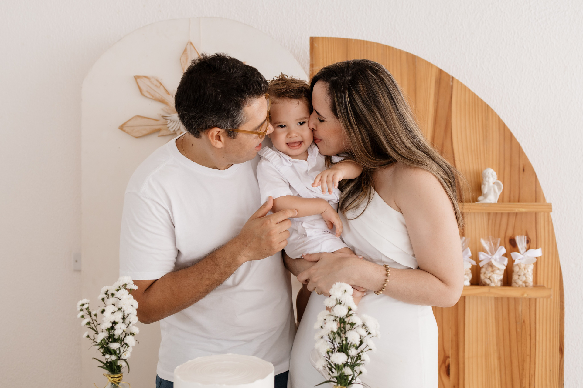 Um encontro íntimo, pensado para estar junto: pais, padrinhos, tios e o carinho atento do irmão mais velho, Samuel, aprendendo aos poucos a dividir as atenções.