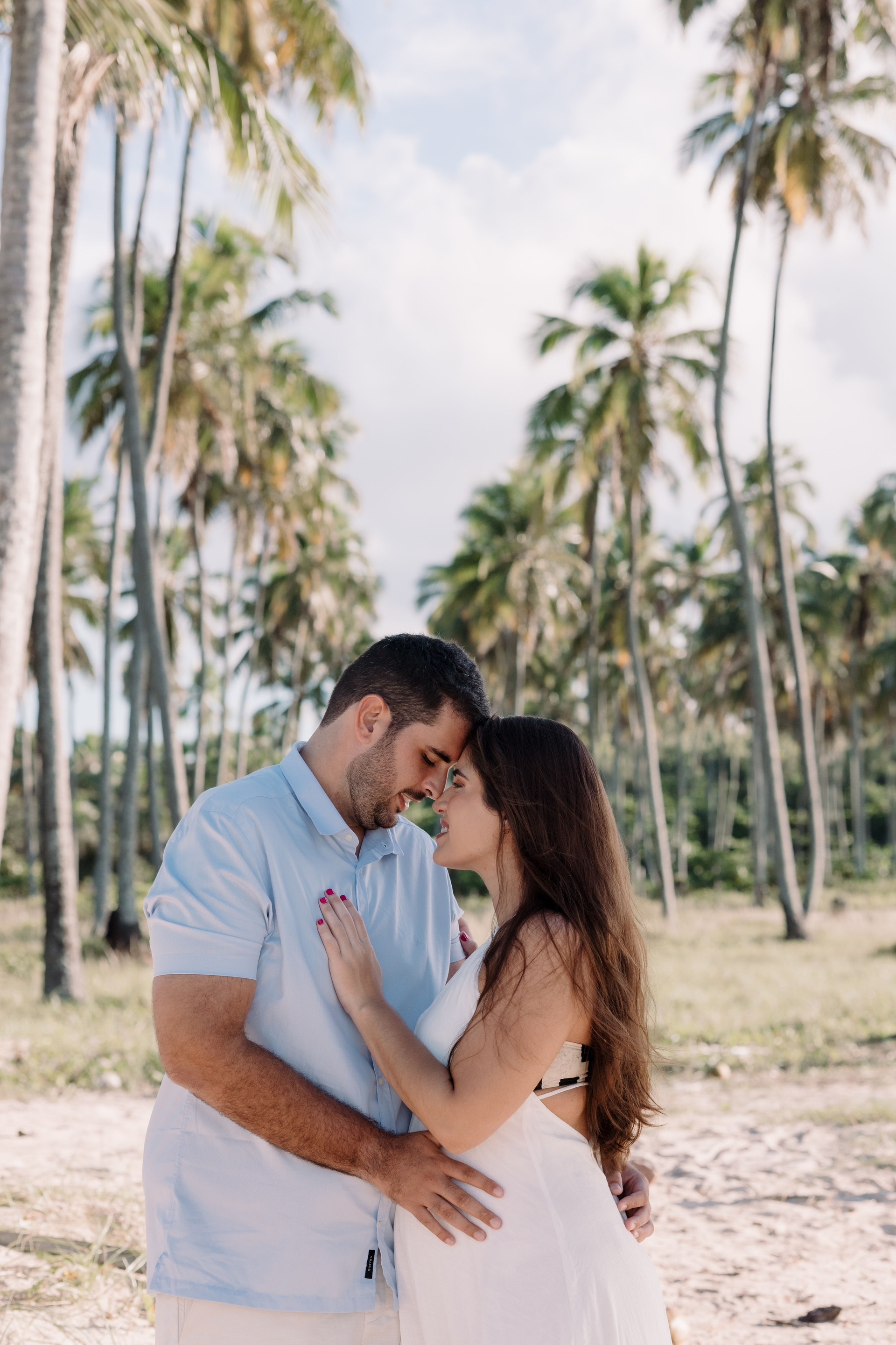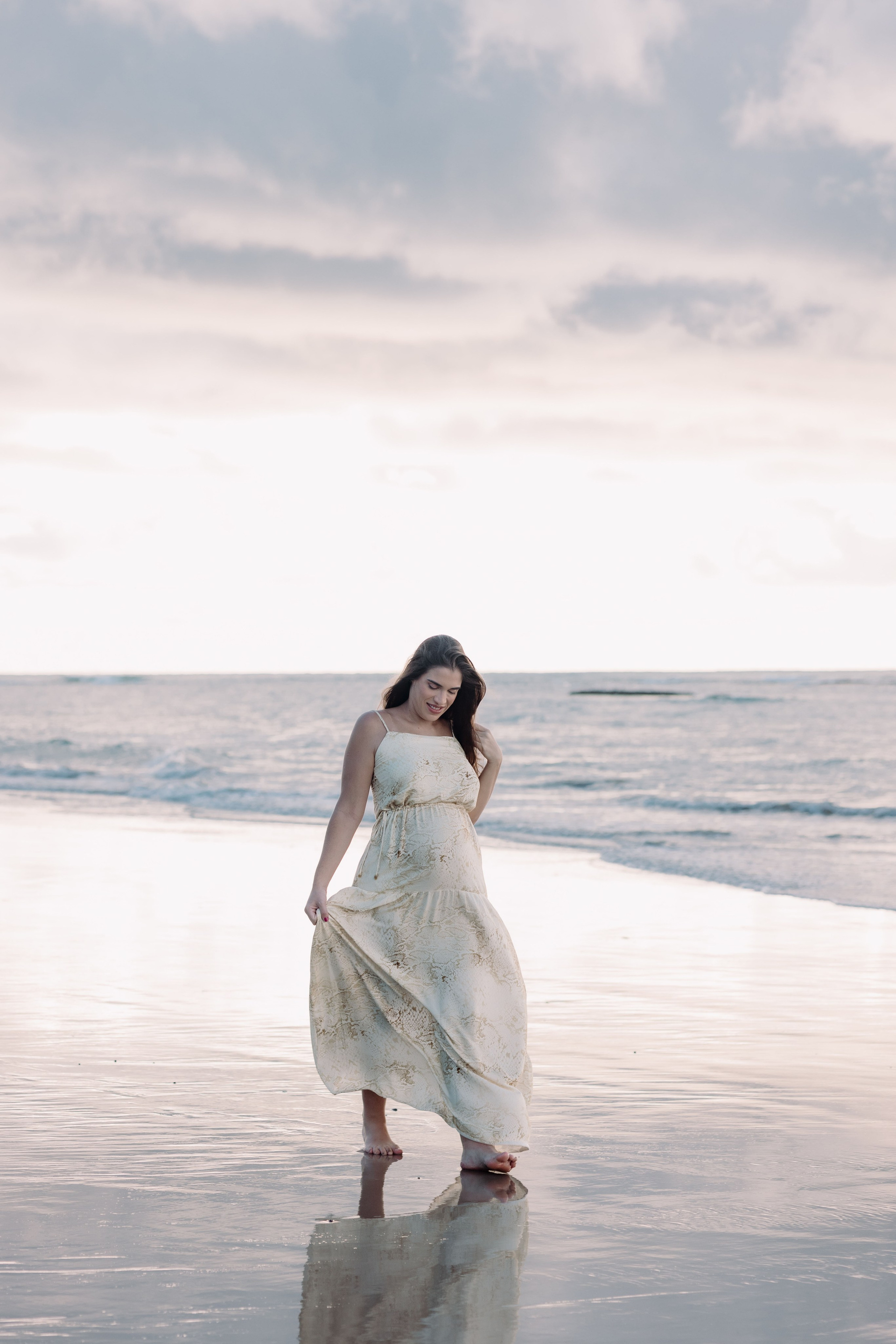 O dia começou com o céu nublado e uma luz suave, daquelas que parecem um sonho. A praia estava tranquila, e tudo foi acontecendo sem pressa. Entre conversas, caminhadas pela areia e pausas para sentir o momento, o ensaio foi ganhando forma de maneira natural.