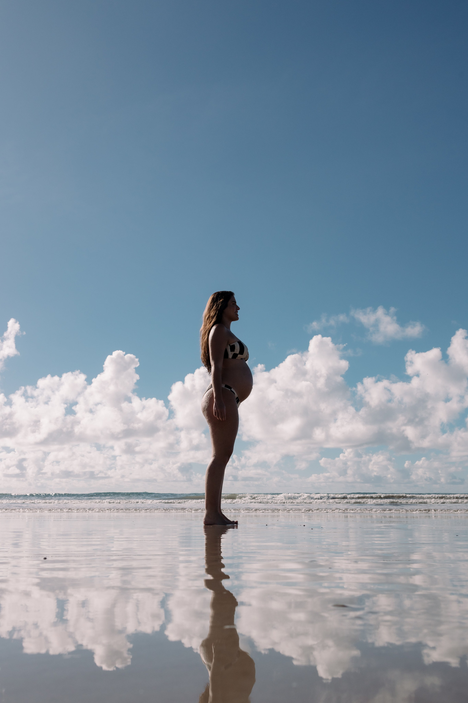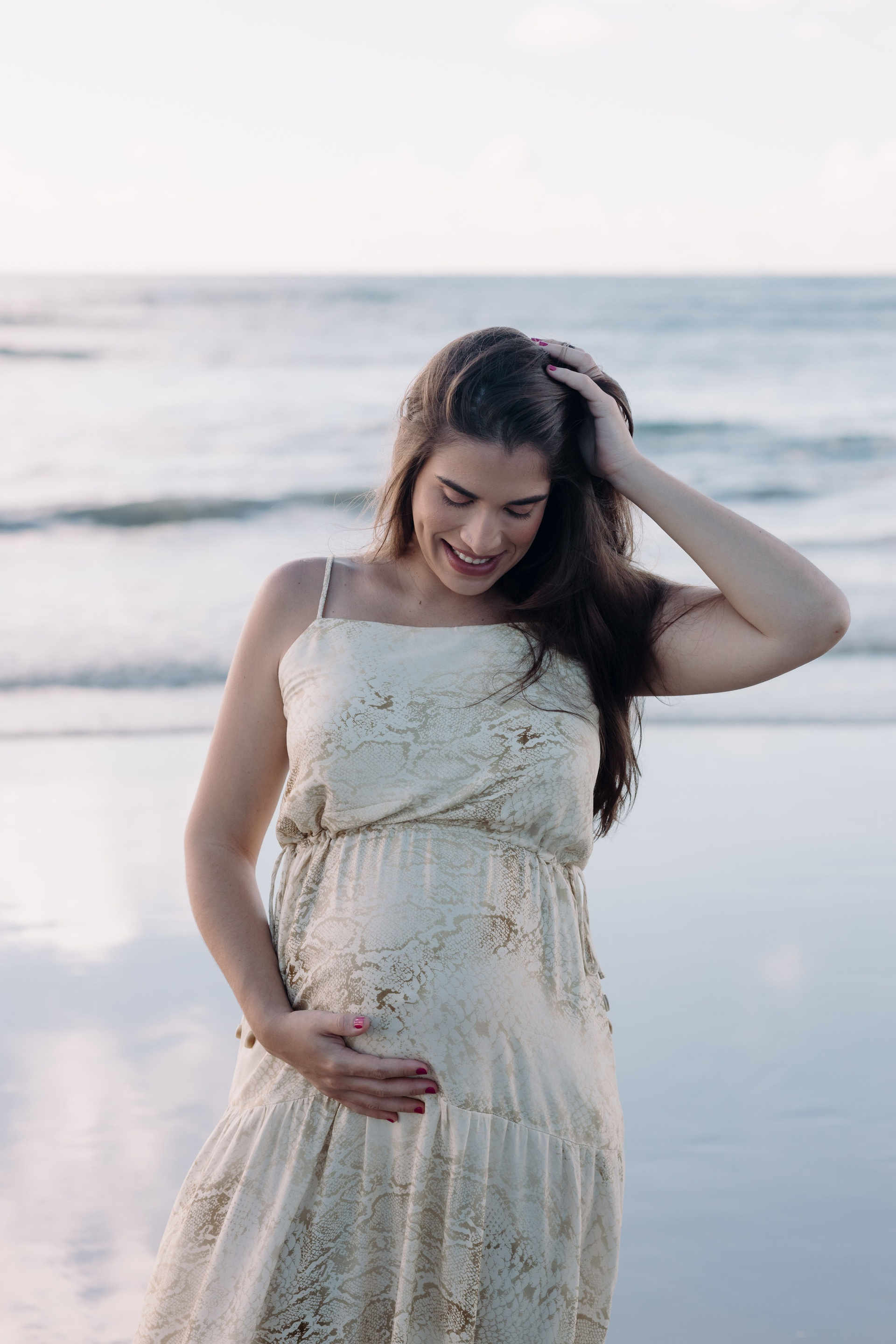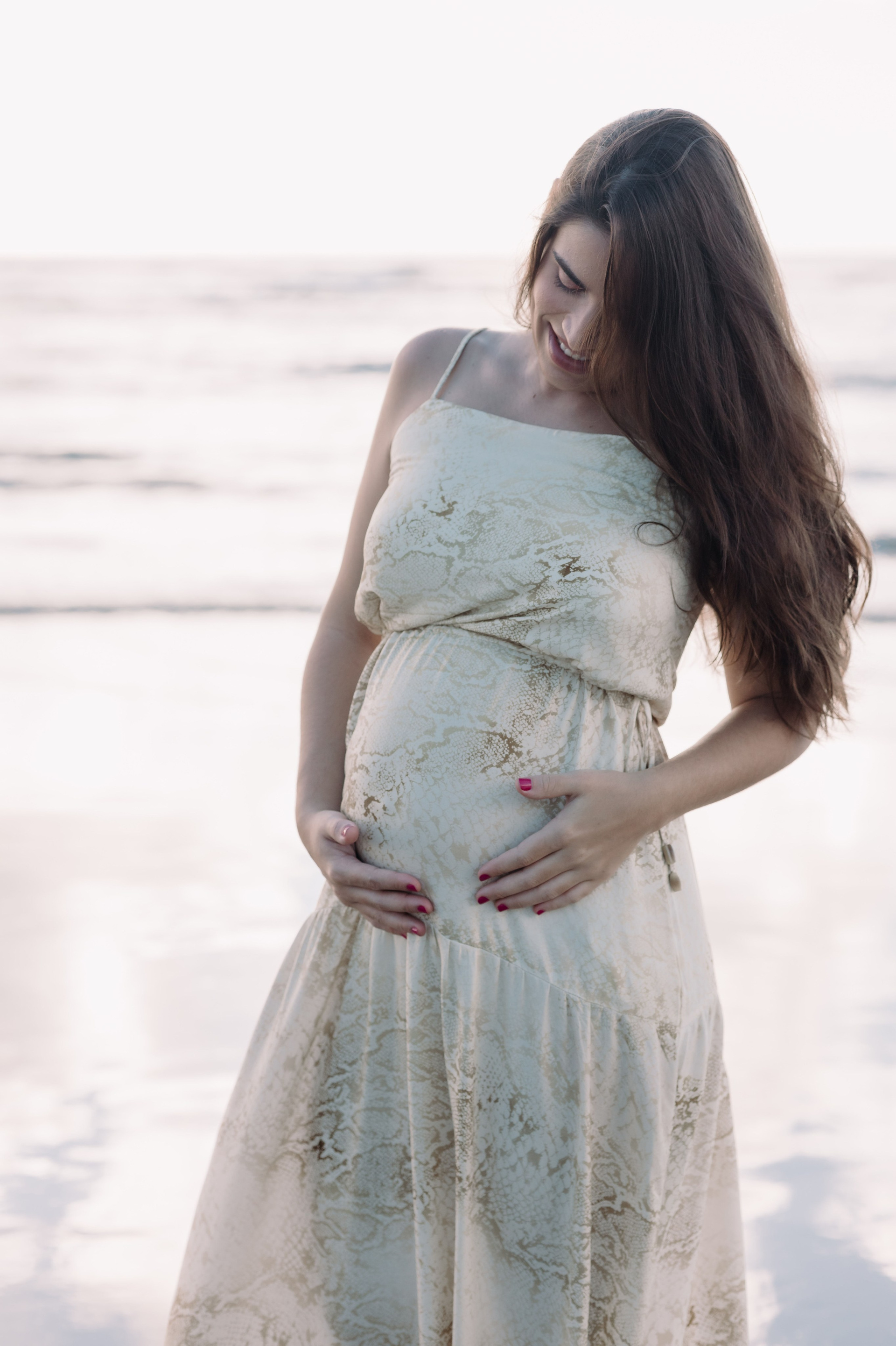 As fotos desse ensaio gestante representam exatamente isso: conexão, tempo desacelerado e a liberdade de viver a gestação do próprio jeito — com o corpo em movimento, os pés na areia e o mar por perto.