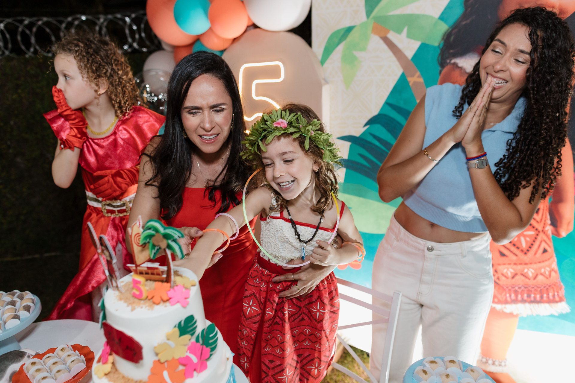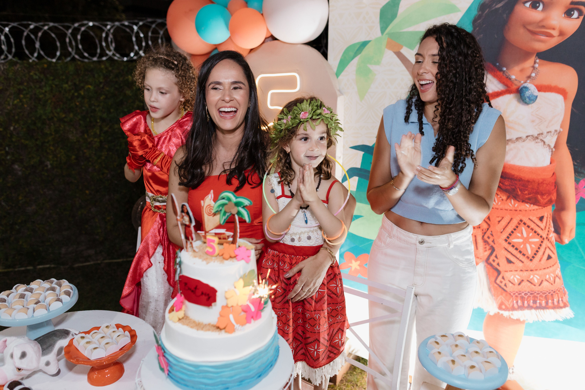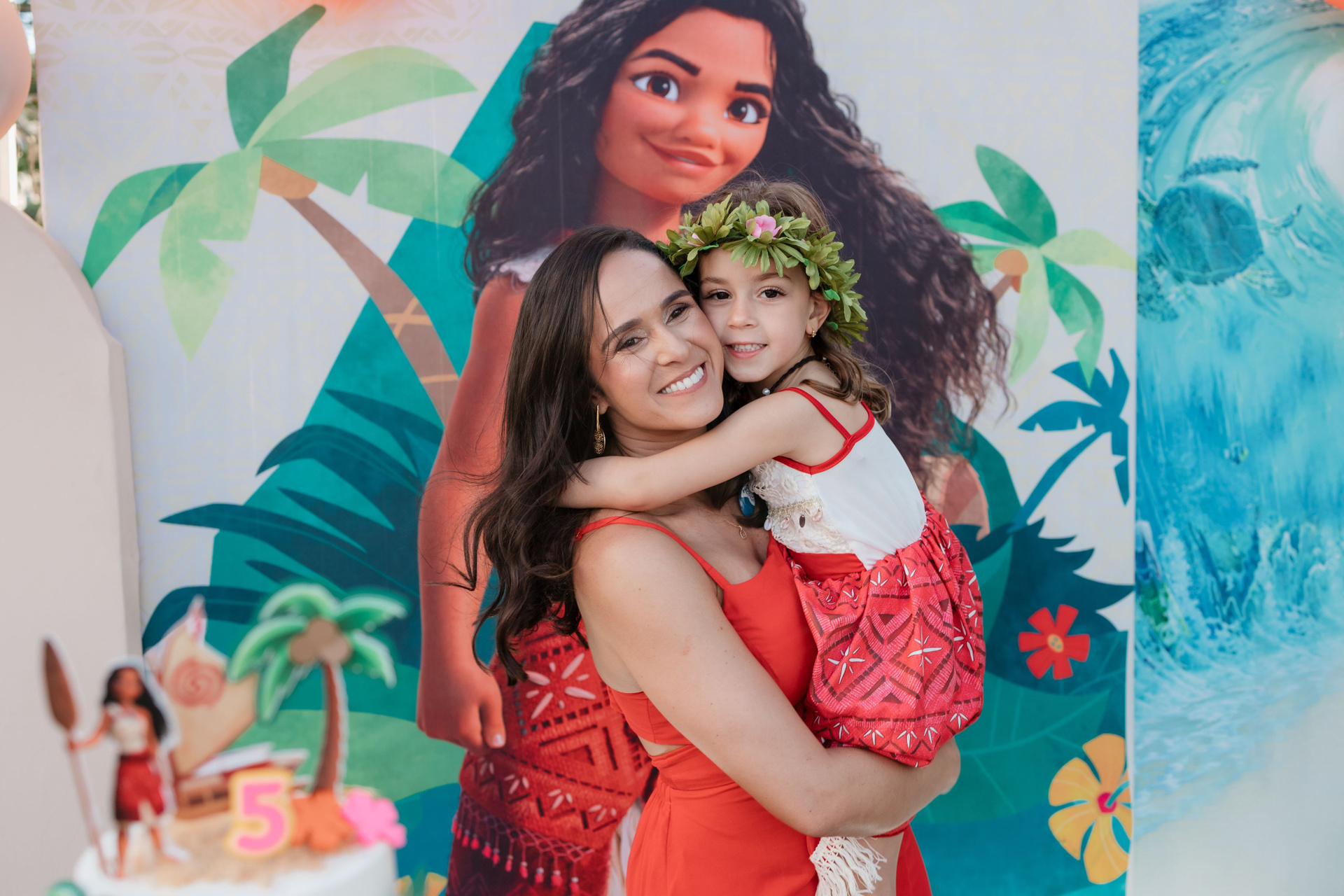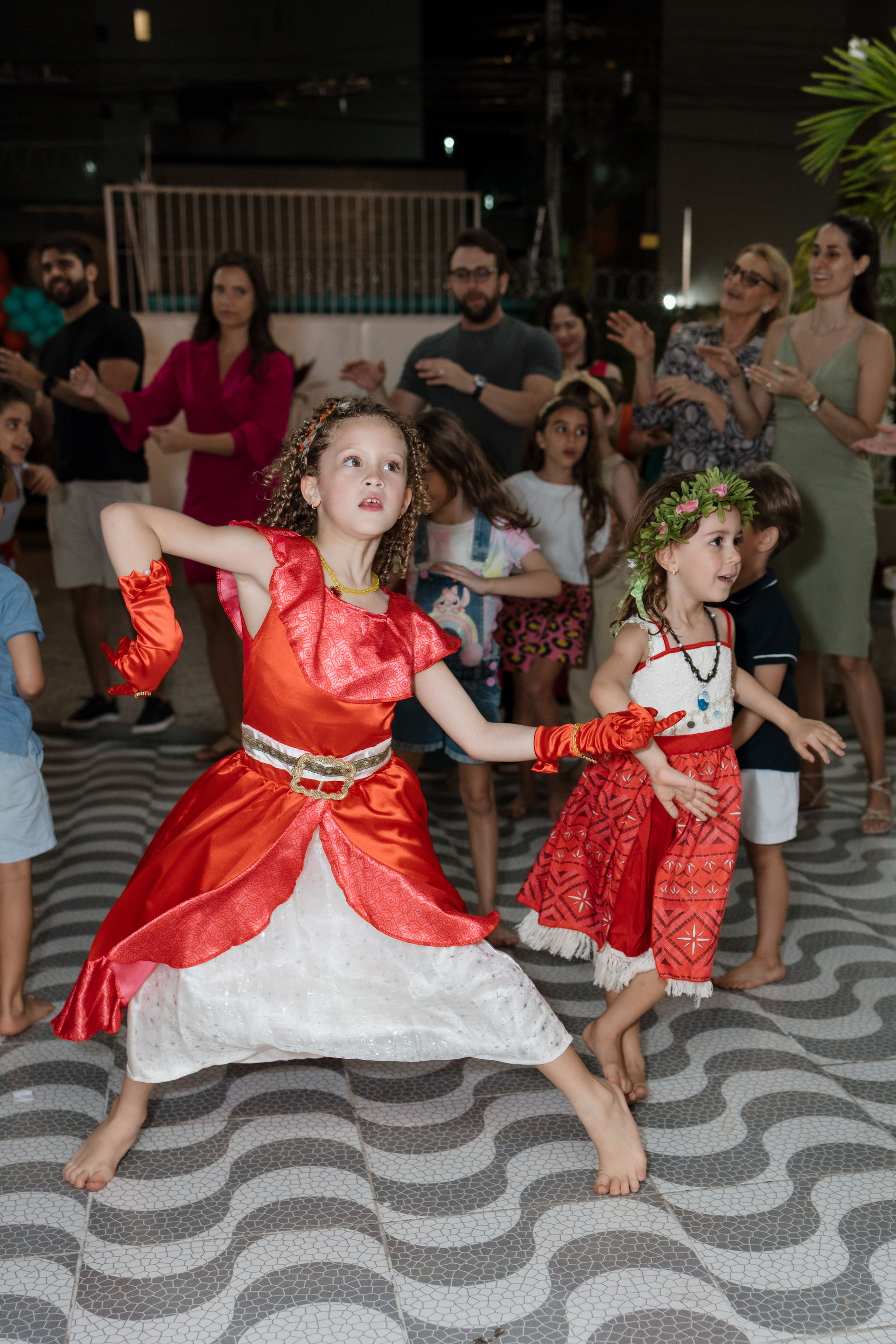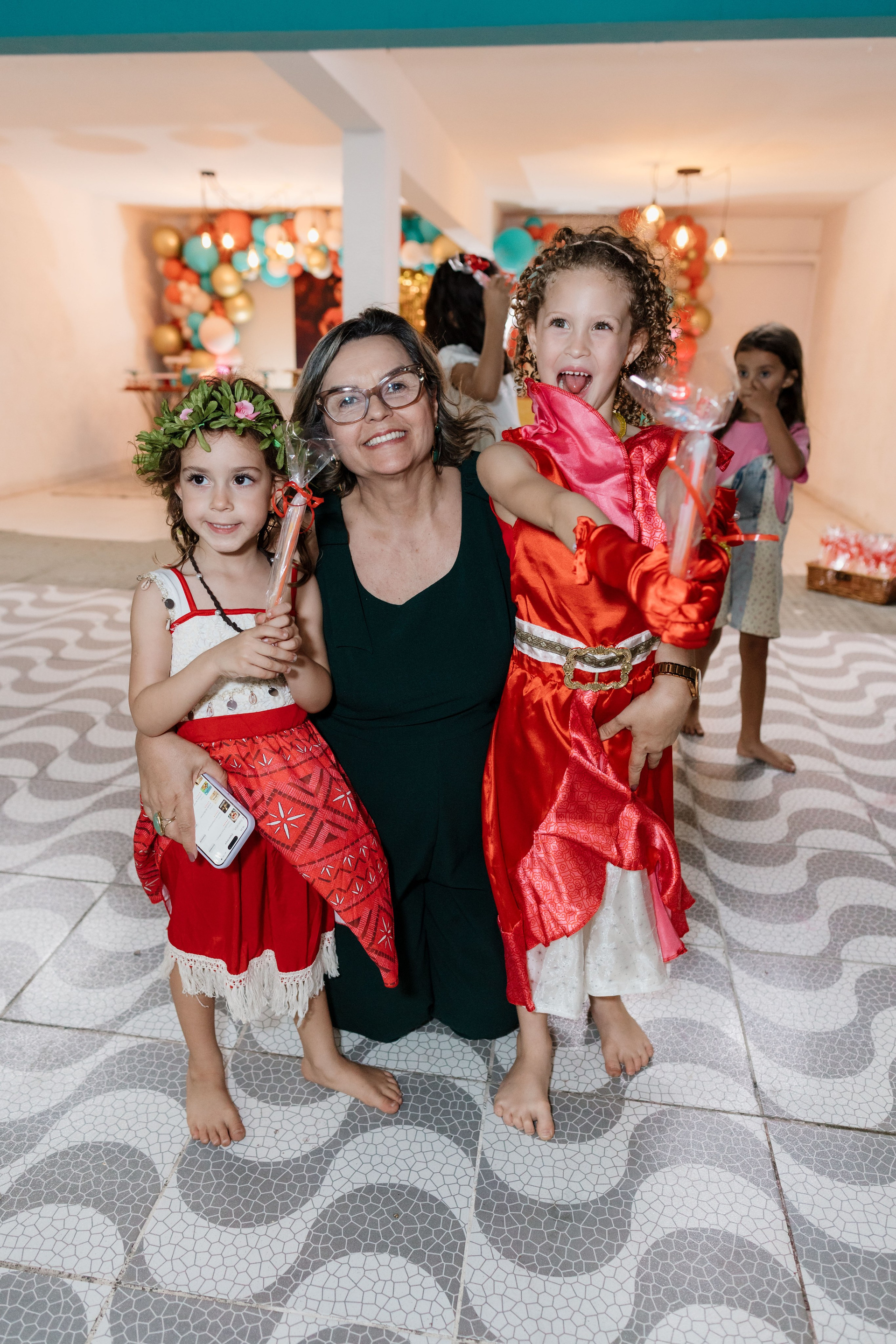 Entre risadas, comidinhas e brincadeiras ao ar livre, a tarde foi acontecendo de forma leve. Para Beatriz, o tema Moana trouxe movimento e cor; para Maria, Elena de Avalor apareceu nos detalhes, respeitando a personalidade de cada uma.