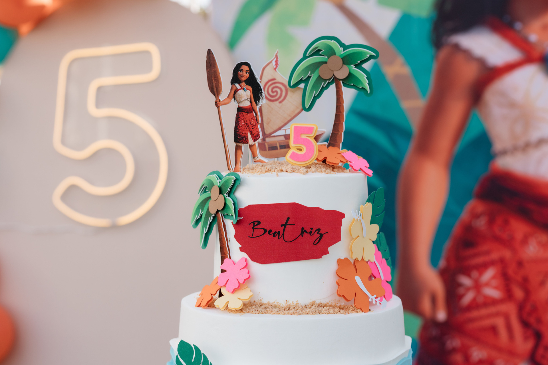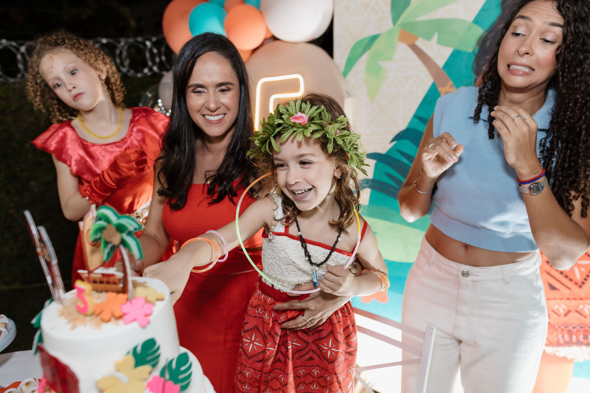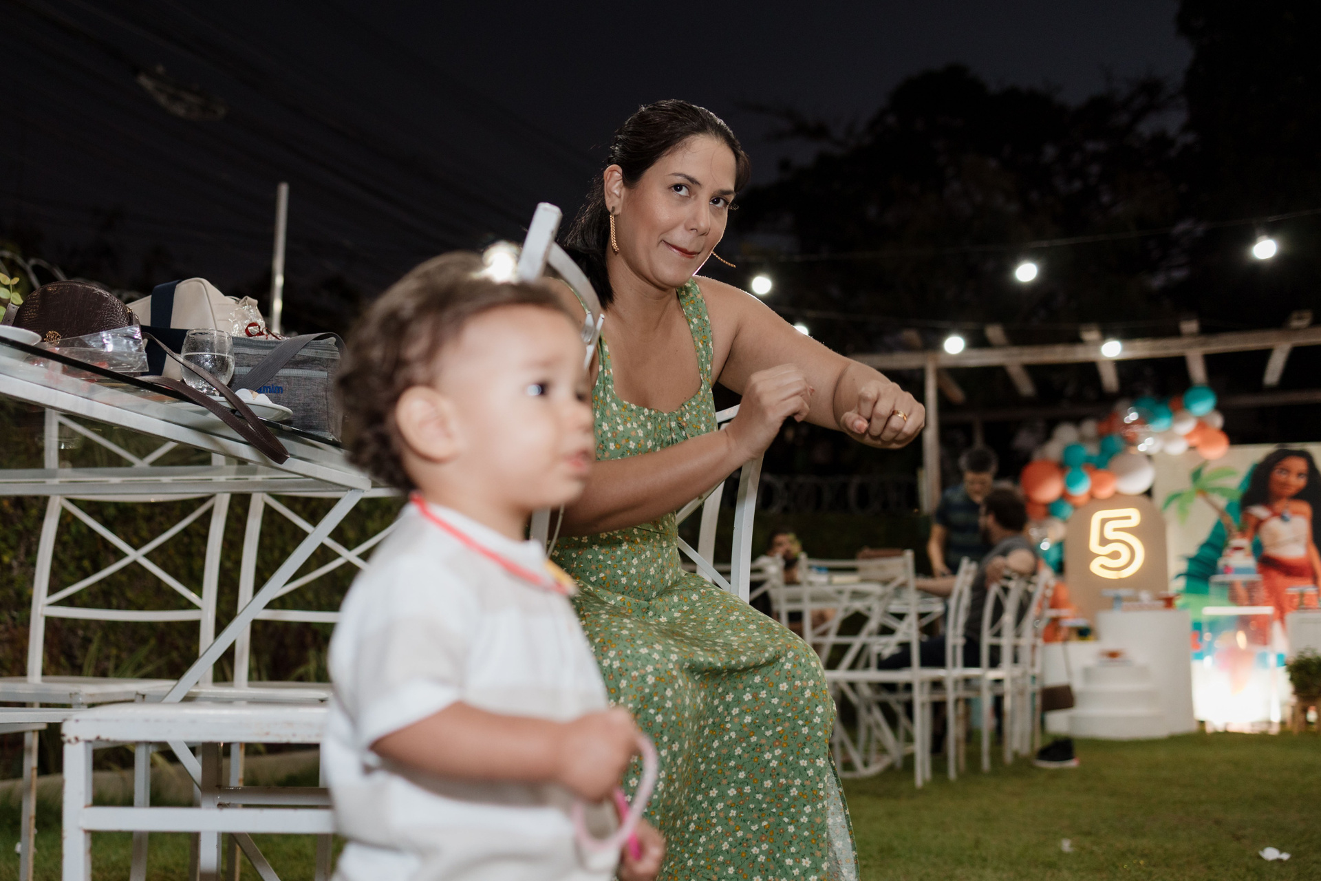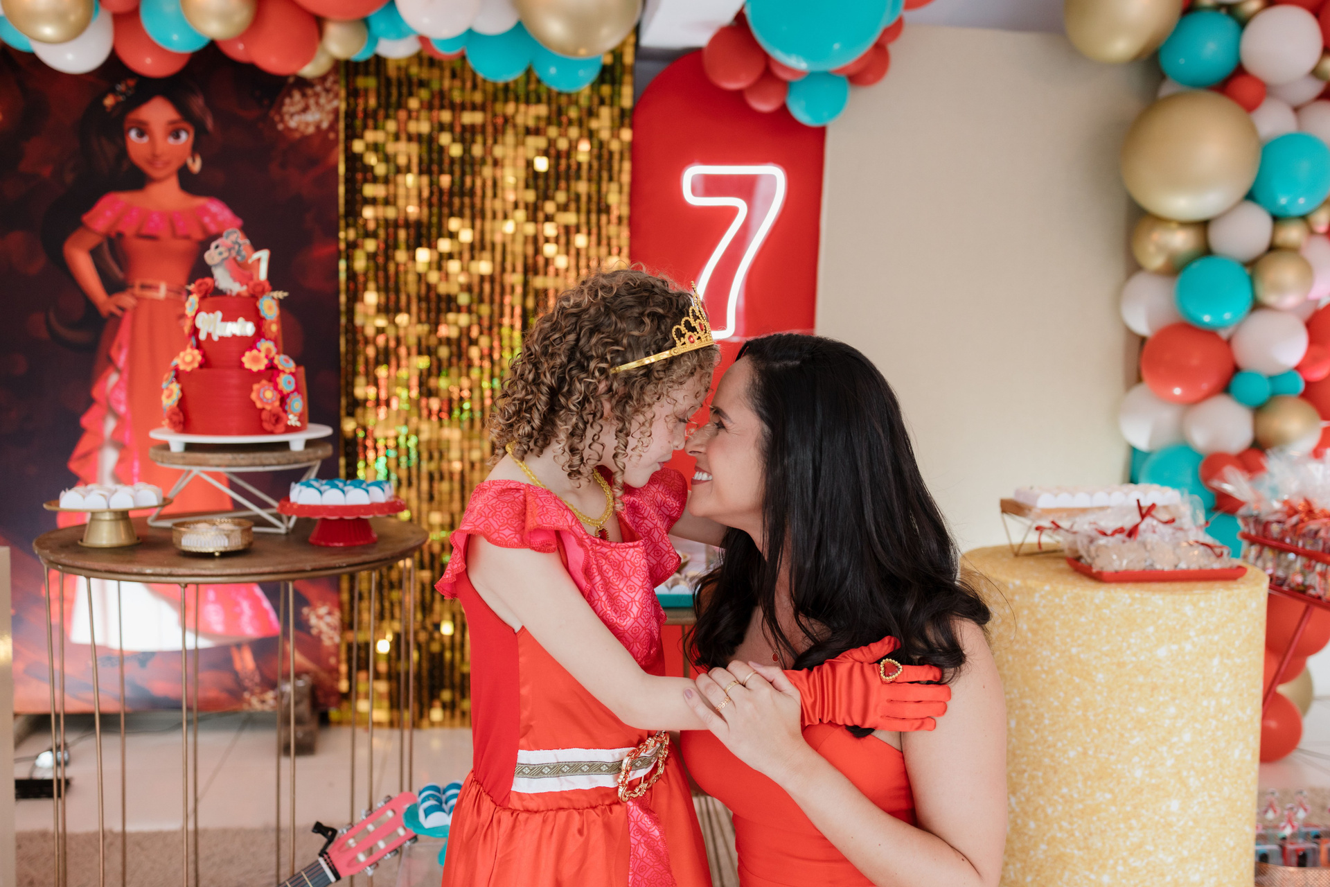 Entre risadas, comidinhas e brincadeiras ao ar livre, a tarde foi acontecendo de forma leve. Para Beatriz, o tema Moana trouxe movimento e cor; para Maria, Elena de Avalor apareceu nos detalhes, respeitando a personalidade de cada uma.